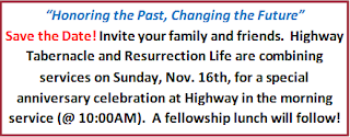 Highway Tabernacle: Morning Prayer @ 9AM; Sunday Worship @ 10AM; Resurrection Life: Sunday Worship @ 12Noon